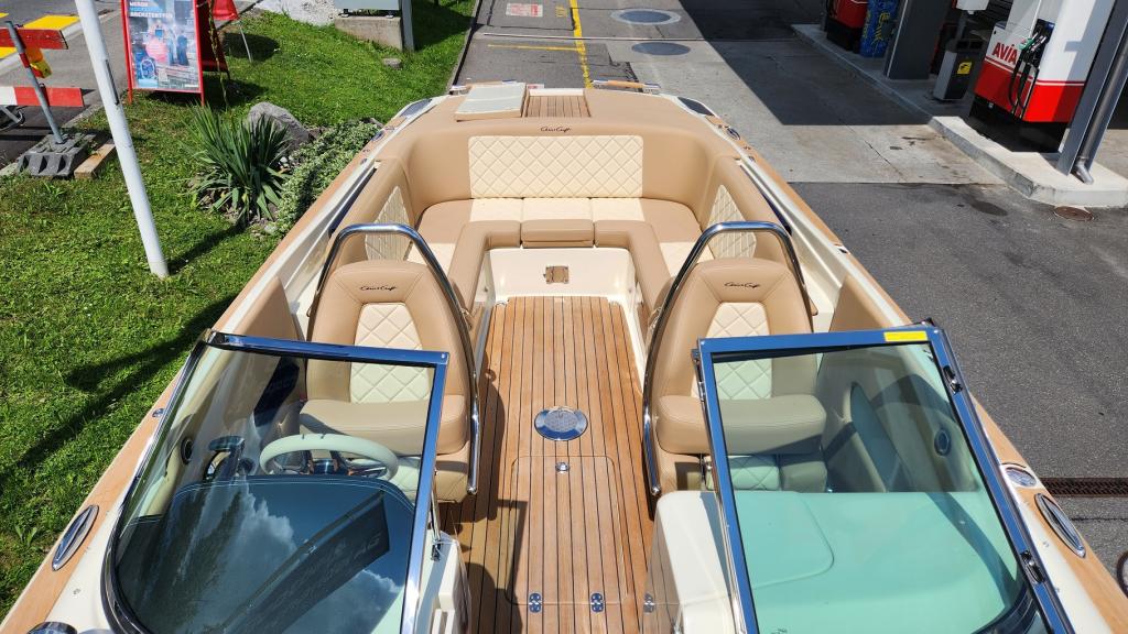Fender Clips (4); Multifunktionales Elektronik Display 7 Zoll; Seekarte Navionics (Alpine, Lakes & Rivers); Premium Audiosystem (Upgraded speakers, subwoofer, remote and DSP amps); Cockpit-Tisch Teak; Motorraumdeckel mit Teakholz & Liegematte; Unterwasserbeleuchtung (2x); Ankerwinde 12V, Anker in Chromstahl und Kette verzinkt - ca. 30 m; Elektrisches Spannungs- System 220V; Anker Bow Locker aus Teakholz (mit Chris-Craft Logo-Einlage); Badeleiter unter Schwimmplatform 3 Stufig - Haltegriff Edelstahl; Heritage Edition mit: Durchgang Motorendeckel, Trittbrett im Cockpit, Fussauflage, Getränkehalter Akzente, Badeplattform und Handläufe achtern, inkl. komplettem Cockpitboden in Teakholz.