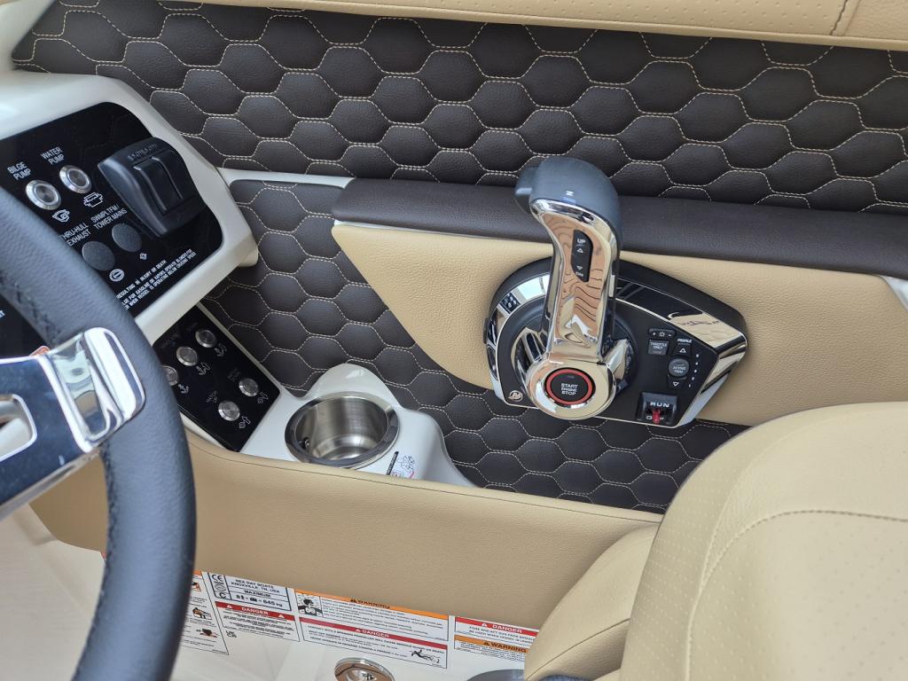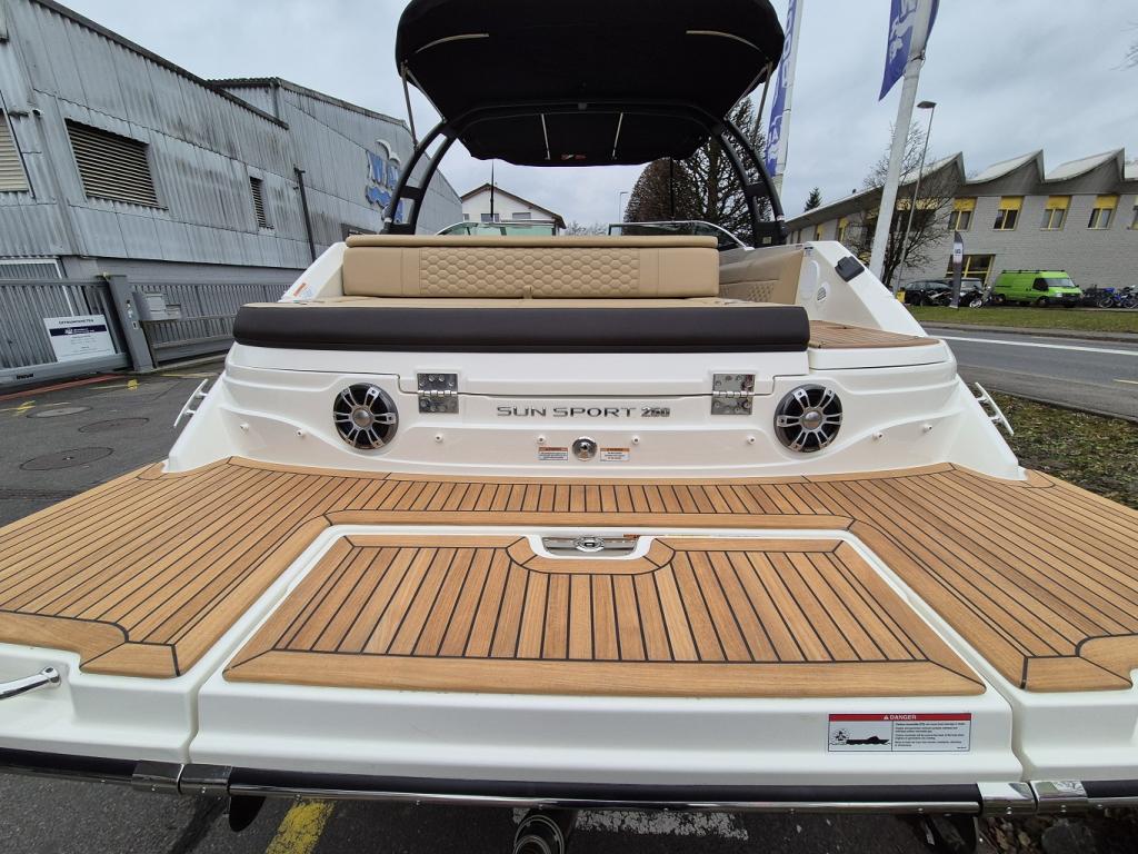 Cockpitpolsterung: DUNE, Bodenbelag: BROWN, Mercury Active Trim, Captain’s Package, Bimini Sonnendach, Bug- & Cockpitdecke, Füllkissen Seitendurchgang Heck, Scheibenwischer, Heckdusche, Anlegescheinwerfer, Flaggenmast mit Sockel, Fenderclips, Wakeboard Tower Schwarz, Bimini Top, Bimini Verdeckpaket, Liegematte Bugdeck, Bugreling geteilt, Cockpittisch Teak Füllkissen rechteckig und klappbar, anstelle Tisch rund aus CP, Cockpitbodenbelag mit Teakholz, Cockpitkühlfach 12V,, Cockpitbeleuchtung LED blau, Digital Dash m. Vessel View 9’’, NAVIONICS Seekarte, Stereoanlage Premium, Fusion DAB+ Modul inkl. Aktiver Antenne, Batteriewahlschalter mit Zusatzbatterie, On-board Batterieladegerät (ohne Landanschluss), Luftkompressor, Yachttoilette mit elektrischer Spülung, Tank und Absaugsystem, Trimmklappen hydraulisch, Towerlicht LED 360° montiert, Unterwasserplattform manuell absenkbar, Badeplattform mit Teakholz, Ankerwinde 12V, Kette, Anker Chromstahl, Bugstrahler, Autom. Feuerlöschsystem (Motorraum) u. Handfeuerlöscher 2kg, Wasserlinie Gelcoat – Boot Stripe