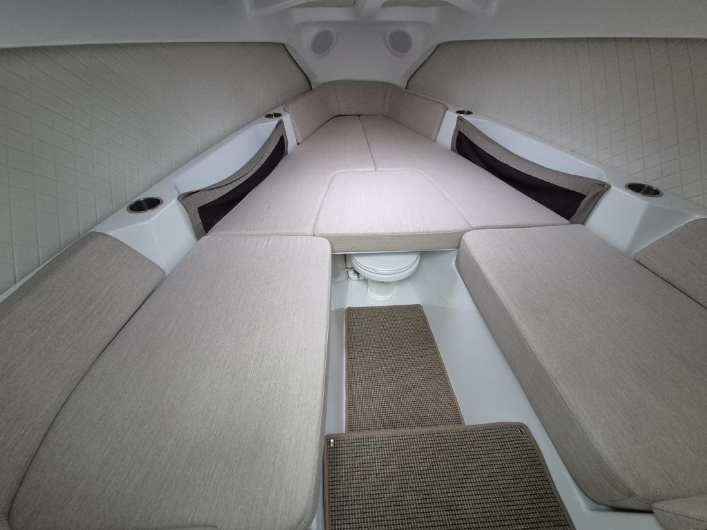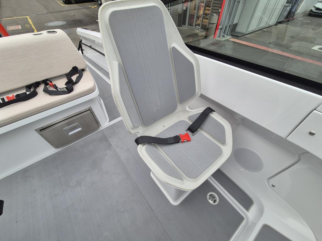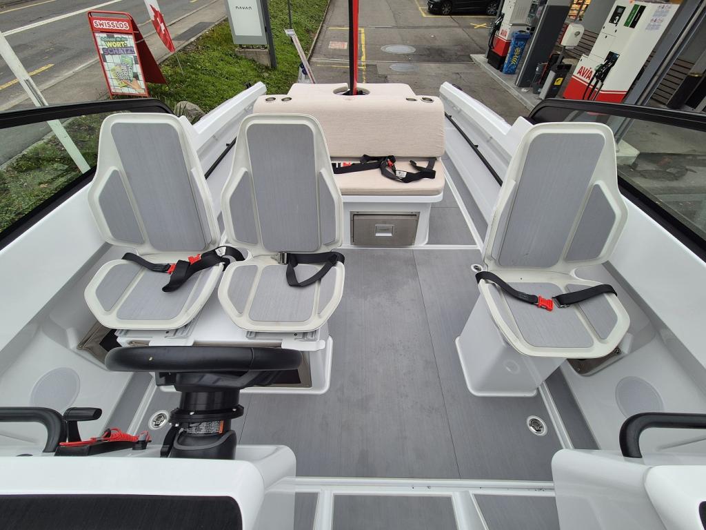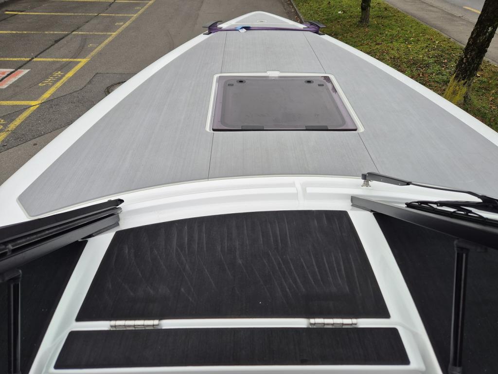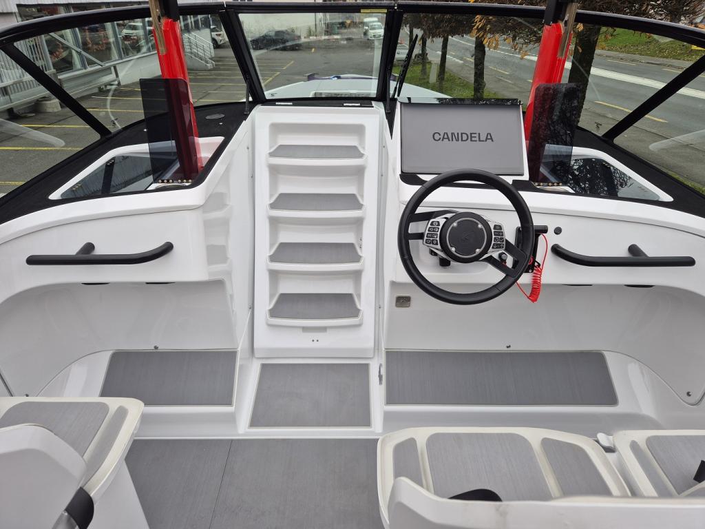 Electric, Battery capacity 69kWh (45kWh) Lithium Ion NMC, Carbon fiber, Range: 57NM (105km) by 22kn (40km/h) and additional 3NM (5km) by 4kn (8km/h) in reserve mode, Hull Color - white, Interieur – nordic mist, Fridge drawer, Toilet in Font Cabin – with 40l septic tank, Cockpit Carbon Fiber Table – storable under sunbed, Harbor Cover – protection for front-, aft and windshield of your Candela, Courtesy Deck Lighting – warm white LED light digitally controlled, Audio Package – Fusion, Bluethooth, 6 speakers 7.7 ‘’200W, 1 10’’ Base 400W, Underwater Lighting - underwater LED-lights (4x), Echo Sounder - activated autom. in non-foiling mode. Integrated in touch screen, Rub Rail – RR Swiss, Geofence Security – alerts you in case of unexpected movement is detected, Foldable Aft Swim Platform – 3 steps on aft swim platform, Premium Fender Attachments – hidden pop-up quick attachments, Geofence Security - alerts you in case of unexpected movement is detected, Swim ladder - 3 steps on aft swim platform, Premium Fender Attachments - hidden pop-up quick attachments, Mooring Package - 4 ropes, 8 fenders, Candela fender covers & anchor & rope, including rope, Two Additional Sunbed Seats – Removable extend, sunbed front facing seats, Compass – mounted in cockpit, Bottom paint / Anti fouling, Obligatory boat inventory (CH) - lifebuoy with leash, emergency lights, scoop, 6x automatically inflatable life jackets, signal horn, anchor, mooring lines, etc. CH – provision accouring to swiss law.