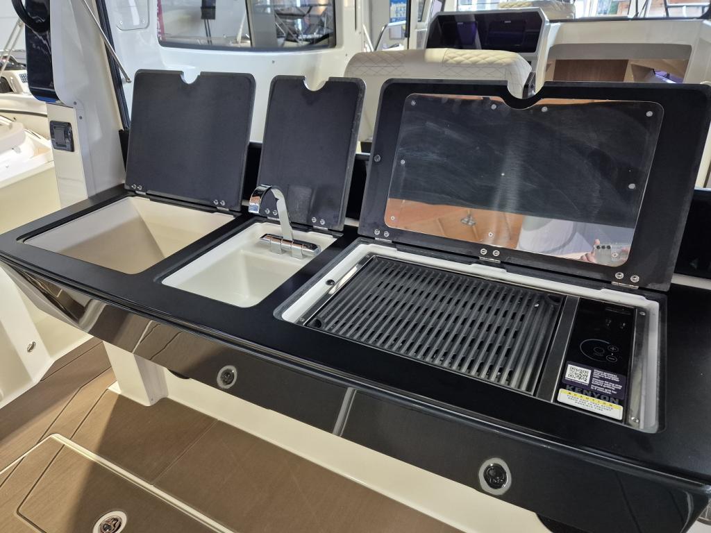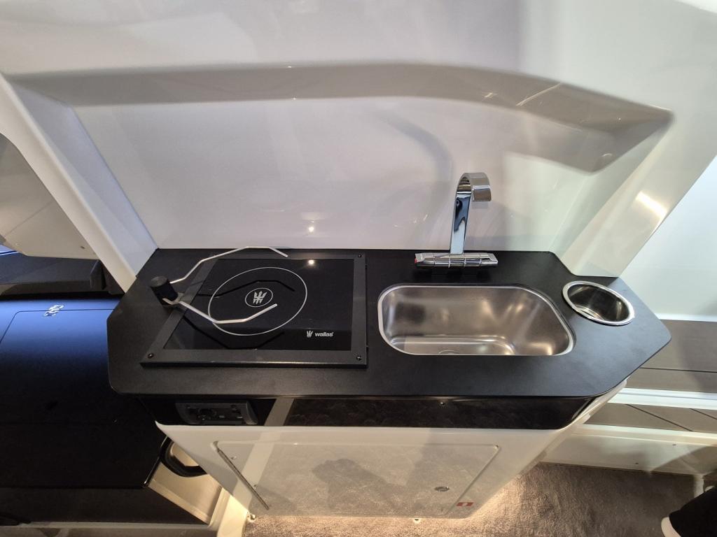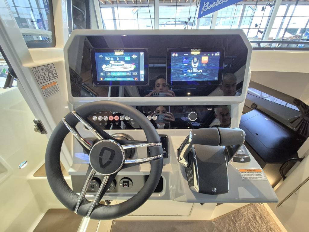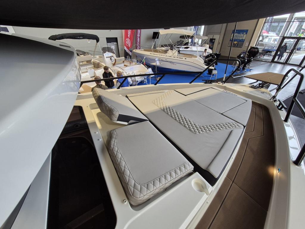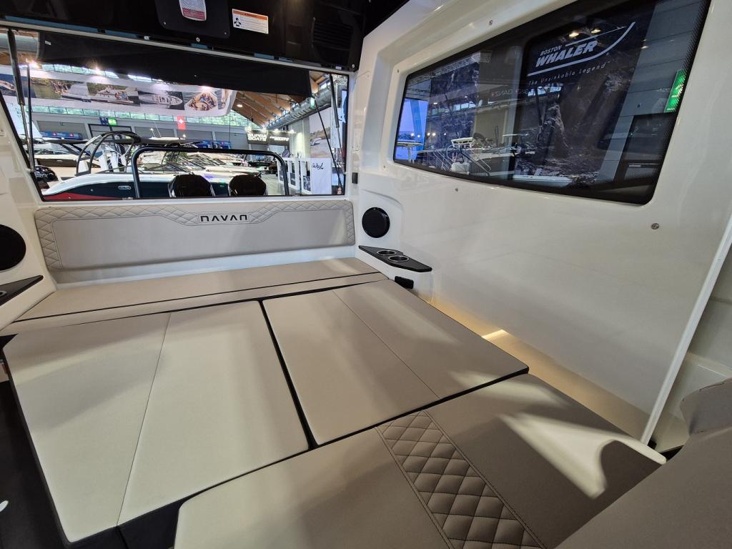 Cockpitpolsterung, Bodenbelag: RUM ESPRESSO, Bodenbelag GatorStep, Rumpffarbe weiss (Hardtop, Rumpfboden, Rumpf), Smart Edition: Landstrom 230 V, Kühlschrank 50L, Warmwassersystem, Wallas-Herd mit einem Brenner, Vorhänge für die Kabine, Oberdeck und Vorderkabine, Sichtschutzvorhang, Klappsitz an Steuerbord, Klappsitz an Backbord, Cockpit-Sonnensegel, Cockpittisch aus echtem Teakholz, Festmacher-Kit (Fender mit Navan beschrifteten Fender-Schutzhüllen und Festmacherleine), Bug-Ankerwinde 12V – elektrisch, Anker aus Chromstahl, Bugspriet, Standard-Klampen (schwarz, nicht versenkbar), Wasser-Ski-Schleppbügel, Dachträger (schwarz), Stereo FUSION (6 Lautsprecher, Verstärker und Subwoofer), Fusion® DAB+ Modul mit aktiver Antenne, Dual Digital Dash GPS (9 Zoll) SIMRAD NSX, Seekarte C-Map, Bugstrahler, Unterwasserbeleuchtung an Schale – blau, ZIPWAKE® - dynamisches Trimm Kontrollsystem, Bordküche aussen mit Spülbecken, Elektrogrill und Invertersystem (Landstrom erforderlich), Kühlbox 20L (Vorderkabine), Dachluke mit Schiebedach zum öffnen (manuell), Innenteppich, Abdeckung der Vorschiffluke (Ausführung: Verdunkelung, Fliegengitter), Flaggenmast mit Sockel, Sonnenschutz im Bug, Grauwassersystem mit Tank und Absaugsystem, Hardtop-Scheinwerfer (LED-Bar), Abdeckung für Rücksitz und Bug-Sonnenliege